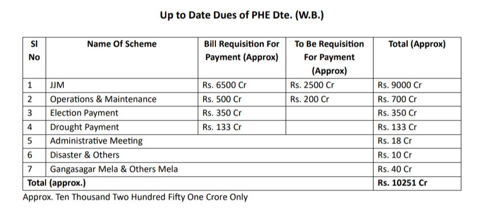 ২৫-২৬ অর্ধবর্ষের মাঝখানে দাঁড়িয়ে আমরা বাংলার ঠিকাদাররা জীবন মরণ লড়াইয়ে সম্মুখীন। আমরা সরকারের ঘোষিত পরিকল্পনা মোতাবেক সারা বাংলার ১কোটি ৭৩ লক্ষ্য বাড়ির মধ্যে প্রায় ১কোটি বাড়িতেই ইতিমধ্যেই জল সংযোগের কাজ সম্পাদন করেছি তবুও সারা বাংলায় JJM প্রকল্পে জমাকৃত বিলের টাকার পরিমাণ প্রায় ৫০০০ কোটি টাকা।